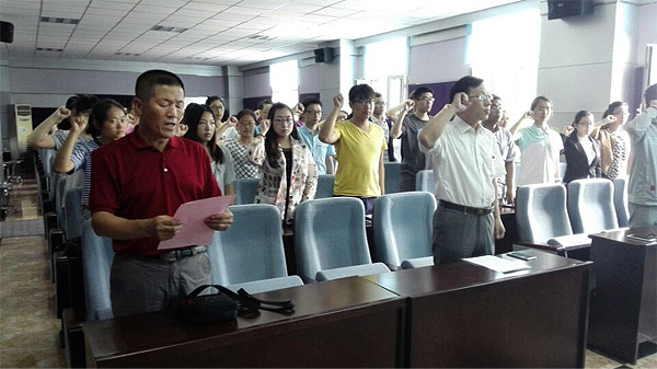 为了弘扬和传承中国共产党的精神,为党组织增添新鲜血液,2015年7月1日亚洲无码 举行了庆祝建党94周年暨预备党员入党仪式。亚洲无码 党委书记钟绍峰、副书记兼副院长刘丽、学生工作办公室主任吴晓辉,团委书记苏国范、党务秘书曲超、院工会主席胡志宏老师以及41名新党员参加了此次大会。会议由副书记兼副院长刘丽主持。 入党宣誓仪式在庄严的《国际歌》中拉开帷幕。首先由副书记兼副院长刘丽宣读41位入党同学名单并对他们表示祝贺。随后,在老党员胡老师的带领下,41名预备党员举起右拳,面对鲜红的党旗齐声宣读入党誓词,向党组织做出了庄严宣誓。12级董雪洁同学代表新党员进行了发言。她发达了此时激动的心情,并感谢党组织与老党员的热切关怀,表明要认真学习党章,积极向党组织靠拢,充分发挥党员的模范作用,努力成为合格的中国特色社会主义事业的建设者和接班人。最后,党委书记钟绍峰发表讲话,指出入党宣誓仪式是加入党组织的重要环节,也是对新老党员一次深刻的党性教育,同时也是对建党94周年的纪念。鼓励党员特别是新党员要回顾历史,学习东北抗联精神,并提出坚定信念、牢记宗旨;遵守纪律、树立形象;加强学习、增强本领这三点想法,同时表达了对新党员的希望,最后,赢来了同学们阵阵掌声。 此次宣誓仪式,旨在培养优秀的党员,为党组织带来更有活力的新因子,为我院学生树立榜样,让更多的青年学生积极向党组织靠拢,在党的带领下不断前进,为我们国家建设做出贡献。
