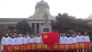 本科生第四党支部组织策划的党员先锋工程“健康所系、性命相托”系列活动之白求恩像前宣誓活动于新民校区基础楼白求恩雕像前举行。2011级学生第四党支部全部党员及预备党员,2011级医事法学专业、放射医学专业全体同学参与了此次活动。