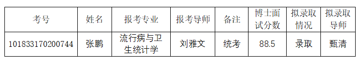 学校为流行病与卫生统计学专业追加1个招生名额,按照总成绩由高到低的录取原则依次录取,现将录取信息公示如下: