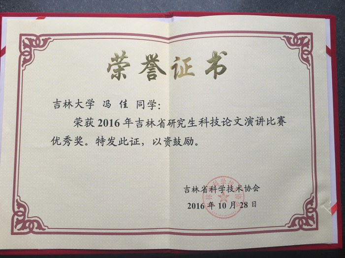 为培育造就优秀青年科技人才,打造吉林省高层次科技创新人才后备队伍,吉林省科学技术协会举办了“2016年吉林省研究生科技论文演讲比赛”。我院医学信息学专业2014级博士研究生冯佳(指导教师张云秋教授),荣获2016年吉林省研究生科技论文演讲比赛优秀奖。