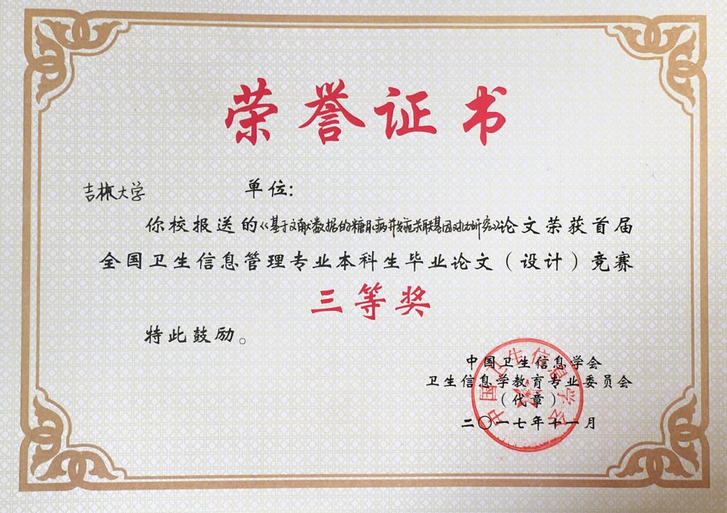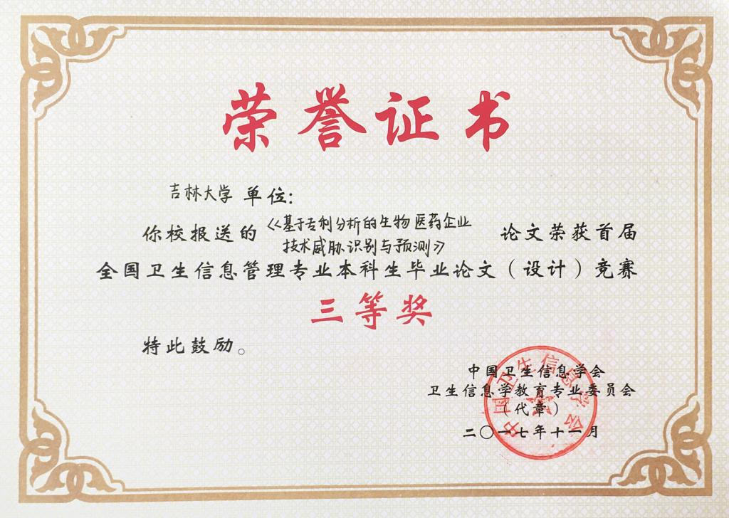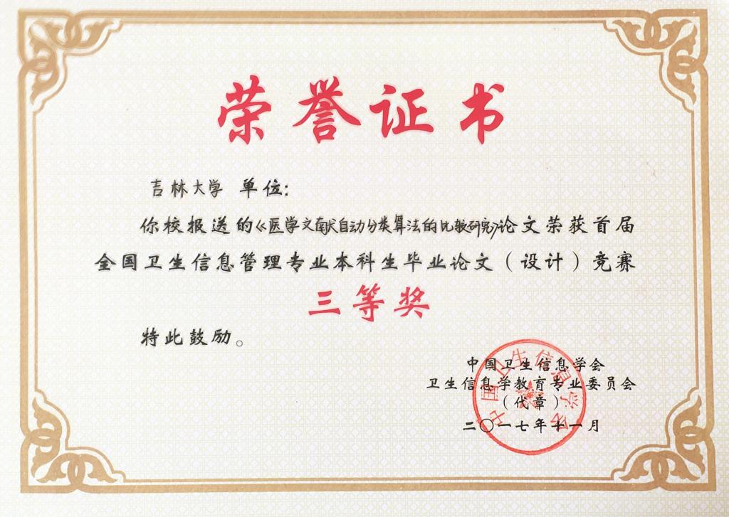 、华中科技大学、中南大学、中国医科大学、山西医科大学、重庆医科大学、广西医科大学、广东医科大学、南通大学、河北北方学院、徐州医学院、滨州医学院、济宁医学院、新乡医学院、湖北医药学院、成都医学院等院校共报送参赛论文作品69篇。经本次竞赛专家委员会匿名评审,共有31篇论文获奖,其中一等奖论文6篇、二等论文10篇、三等奖论文15篇。根据竞赛规则,我院从2017届信息管理与信息系统(医药信息管理)专业本科毕业论文中选送参赛论文9篇,其中《用户主题熟悉度对查询重构行为的影响及熟悉度预测》(刘强,指导教师:孙丽副教授)获本次竞赛一等奖;《基于专利分析的生物医药企业技术威胁识别与预测》(李芳芳,指导教师:王伟教授)、《医学文献自动分类算法的比较研究》(张雅鑫,指导教师:张云秋教授)、《基于文献数据的糖尿病并发症关联基因对比研究》(金姗,指导教师:牟冬梅教授)分别获得本次竞赛三等奖,获奖论文数量位列参赛各院校首位,比较客观地反映了我院本科教学取得的成果。