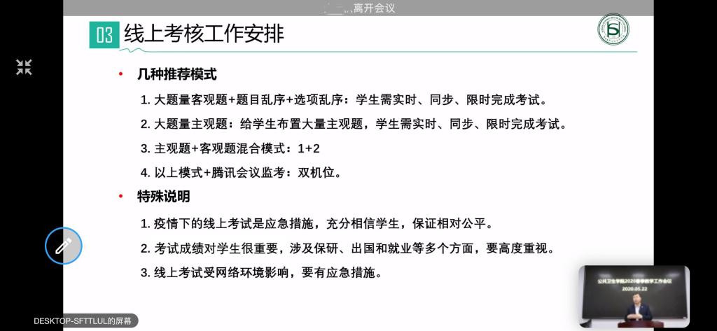 其次,对本学期线上考核及本科毕业论文答辩工作进行布置,以“雨课堂”考核功能为例,对教师进行线上考核讲解,推荐几种考试模式供教师参考,要求各位老师高度重视线上考核,在充分相信学生基础上,保证考试公平、公正,各门课程考核要有相应应急措施。要求各位本科毕业论文指导教师要和学生进行充分沟通,对毕业论文进行最后修改,完成好线上毕业论文答辩和成绩评定工作。