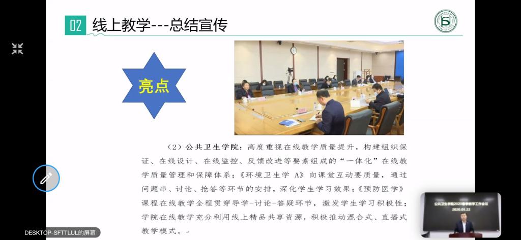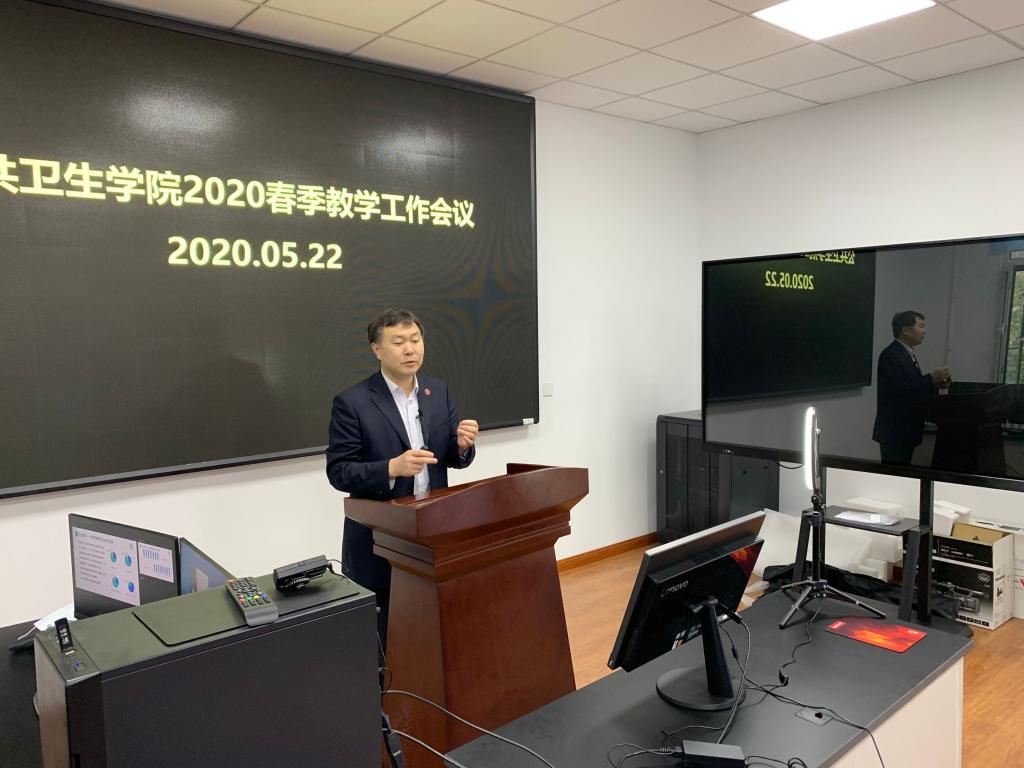 首先,寇长贵副院长对2020年春季学期学院线上教学总体情况进行总结,本学期学院承担医学部各单位课程62门,共70门次,理论课时数为1906学时。除一门课程因条件限制外,全部线上开课,经学生反馈所开出课程的教学效果满意度均达到85%以上。同时,指出我院线上教学存在的不足之处,要求各教研室及教学团队积极进行课程改进,做好课程设计与教学改革,满足公共卫生学科发展的需求,推进创新示范课程建设及制作优质线上课程资源。