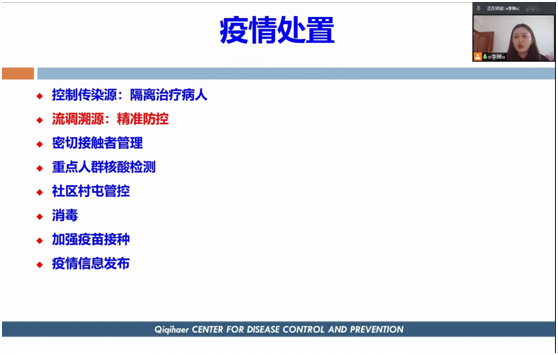 李琳副所长结合当前疫情流行特点和我国的防控策略,以国家最新防控方案为例,重点讲解了职业风险人群和重点机构的疫情监测和处置措施。详细为志愿者们讲解了新冠肺炎流行病学调查的技术要点,如病例的危险因素和暴露史收集、密接信息和行动轨迹排查、数据收集和分析、电话流调的工作技巧等,以实例方式直观地介绍了如何开展疫情排查、规范撰写流行病学流调报告。