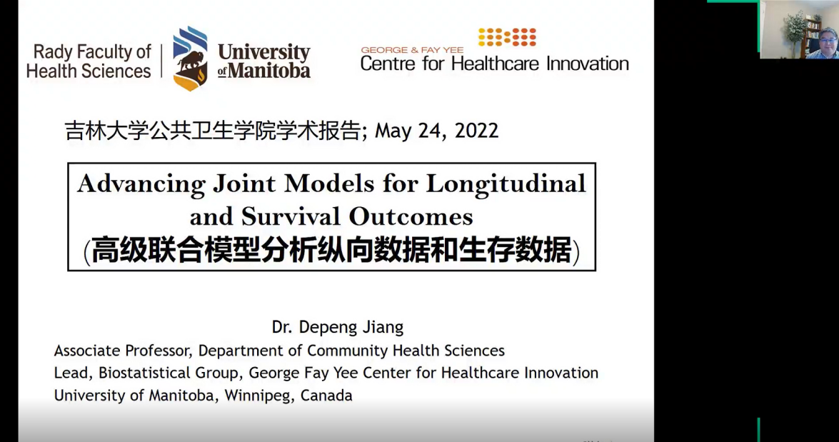 为提升我院师生的统计分析能力,促进学院国际交流,应学院邀请,加拿大曼尼托巴大学公共卫生学系蒋德鹏教授于2022年5月24日线上做了题目为《高级联合模型分析纵向数据和生存数据》的学术讲座。亚洲无码