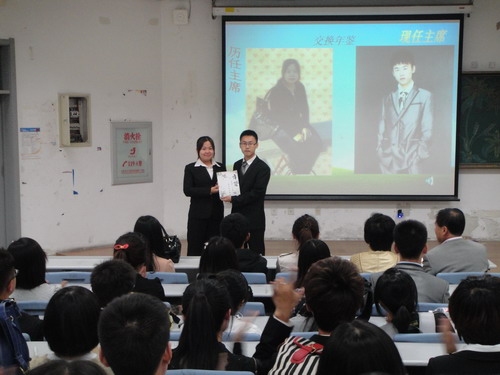会议由学生会秘书部张曦月主持。首先,前任学生会主席刘畅上台演讲,她回顾了过去四年在学生会的工作经历,对学院老师和同学们的支持表示感谢,并鼓励新一届学生会继续做好学生服务工作,再创辉煌。紧接着,新一届主席王政民发表讲话,他就学院的未来发展提出了自己的构想,对学院活动的主题方向提出了“学习相关,生活相伴”。随后,在全体与会人员的掌声中,两任主席进行了学生会年鉴的交接。接着,吴晓辉主任宣读聘书,学院领导和老师为学生会主席、副主席、各部部长颁发了聘书。