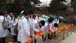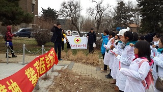 首先,红十志愿者们身穿洁白的医护服组成字方阵,手持红烛,在基础楼正门前的白求恩纪念塑像前庄严宣誓:“我宣誓为红十字会会员,尽忠服务本土及与世界各地红十字会会员联合一致,扶助疾病及患难人士。谨记人道、博爱、奉献的宗旨”。声音在回荡,烛光在闪动。这饱含激情的庄严宣誓,传达的是每个红十会员、每位医学学子的内心和信仰。之后由全体人员在“弘扬白求恩精神,攀登医学新高峰”的横幅上签名立志。虽然还飘着小雪,但大家并不在乎寒冷,场面庄重严肃而又温馨和祥和。宣誓仪式结束后,同学们在新民活动室里聆听并实践了学长讲解的测血压的方法。