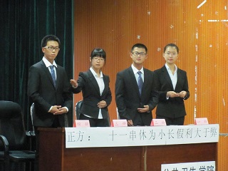 主持人宣布开始后,由双方辩友分别自我介绍,并简单展示本方观点;之后,有请评委上场。主持人宣布比赛规则和评分标准。紧张热烈的比赛随即开始,本场比赛共四个环节。在整场辩论过程当中,亚洲无码