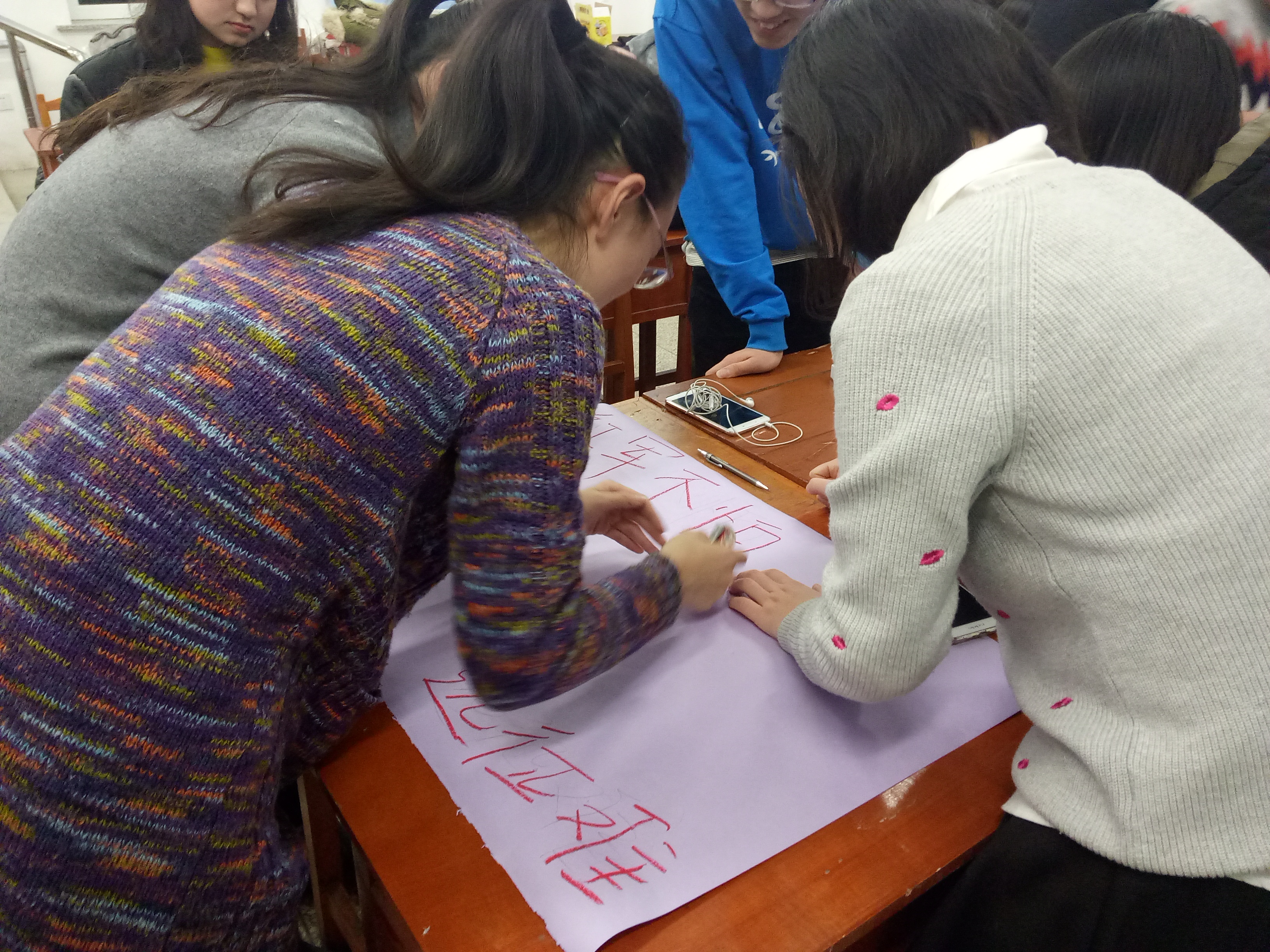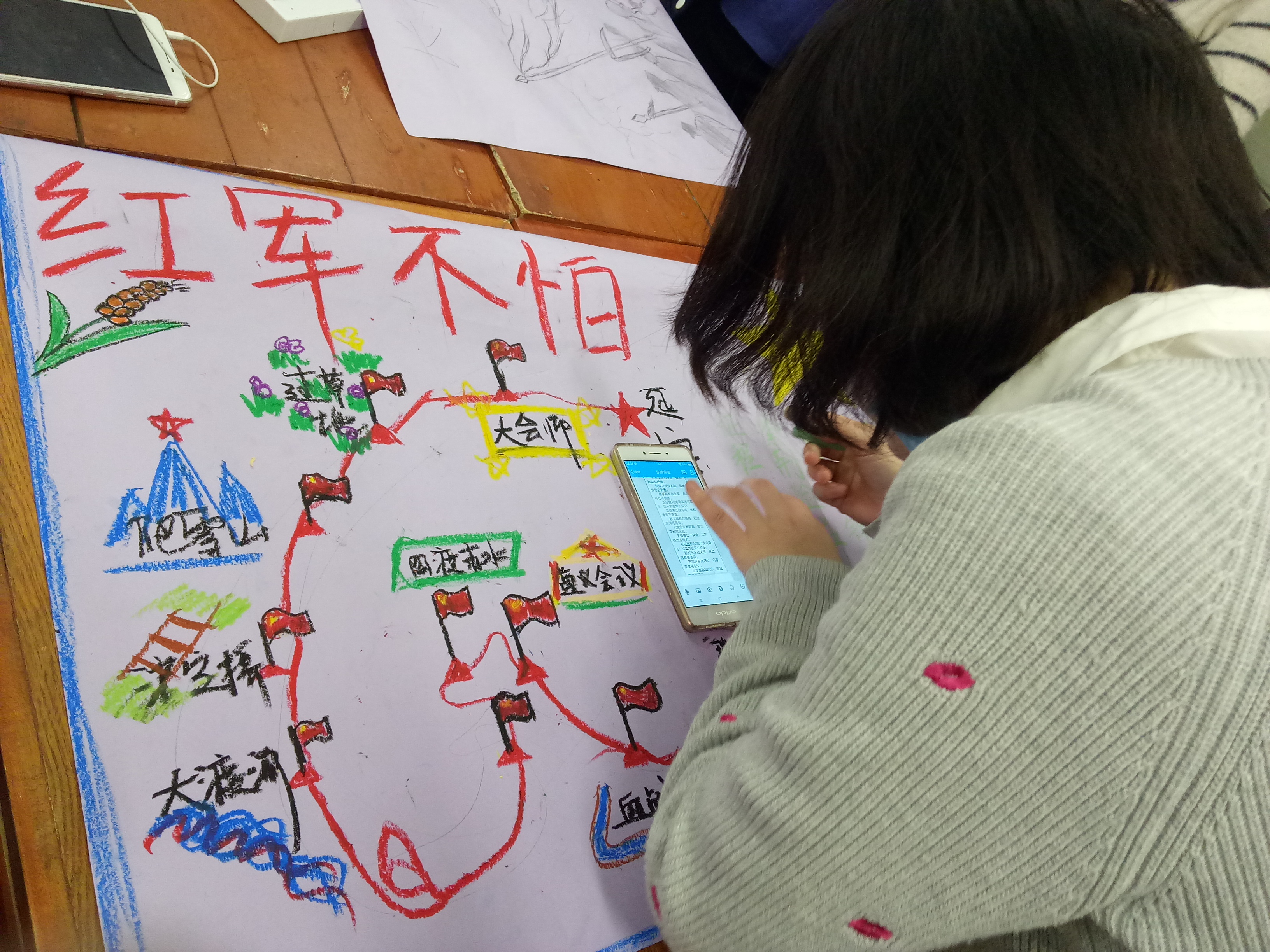 本次班会主要分为3个环节进行。第一环节是“彩绘黑板报”,将长征中的点点滴滴画于黑板之上,抒发同学们内心的长征情怀。第二个环节是“绘制手抄报”,用图形、色彩、文字展现出长征路上的艰辛以及红军战士们的勇敢、顽强。“五岭逶迤腾细浪,乌蒙磅礴走泥丸”的壮阔气势,“更喜岷山千里雪,三军过后尽开颜”的灵魂震撼,伴随着红军战士们那种冲破困境的勇气与感动,跃然纸上,触动人心。第三环节是“重走长征路”,在中国地图的基础上,同学们手绘出了长征路线,并前后勾连成完整的长征线路图,将自己零碎的记忆拼接在一起,缀连出的不仅仅是红军战士们翻过、淌过的万水千山,更是革命先烈们用血泪为子孙后代铸就的光明前程。