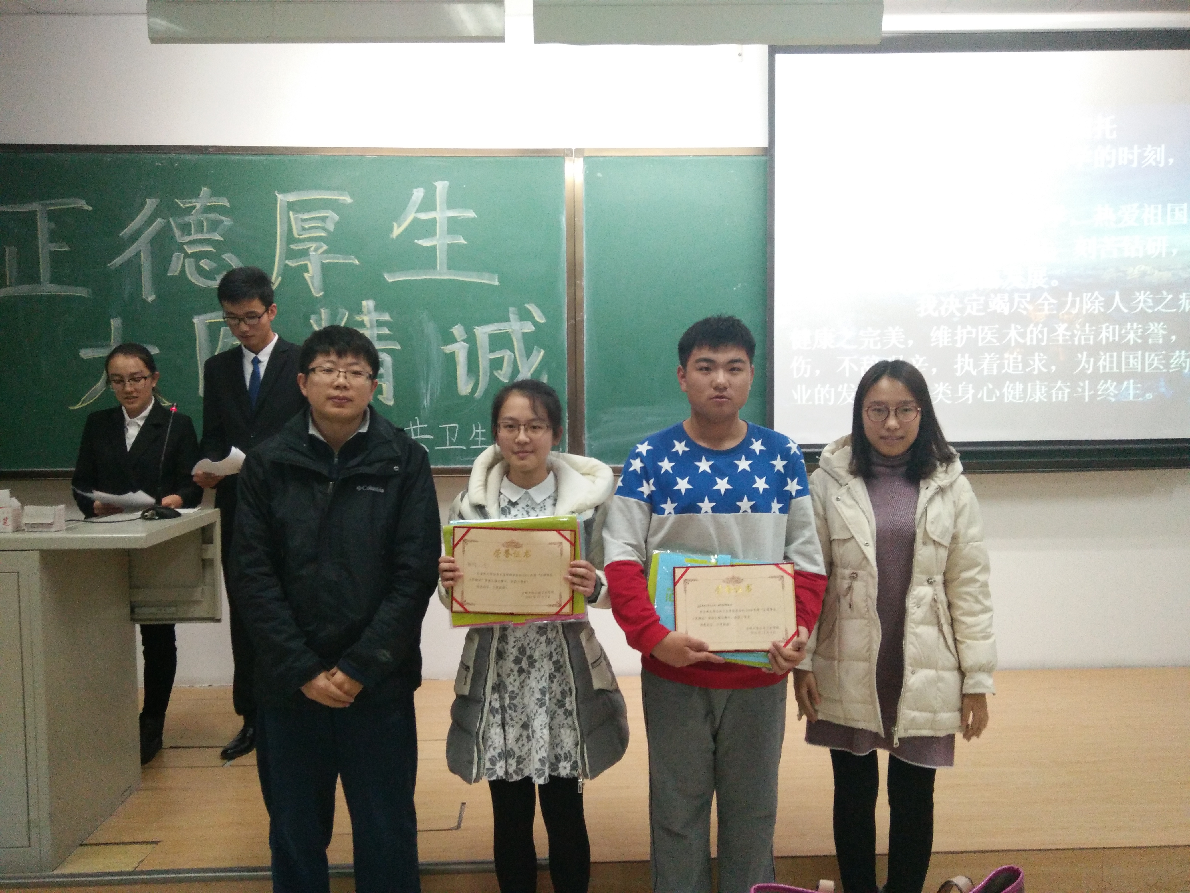 在一个多小时的比赛过程中,现场笑声不断、掌声不停,在同学们的欢呼声中,比赛最终决出了名次。主持人随后宣读了比赛结果,2016级预防二班摘得了一等奖;获得二等奖的为2016级医药信息管理专业和预防三班;2016级预防一班、放射一班和放射二班获得了三等奖。