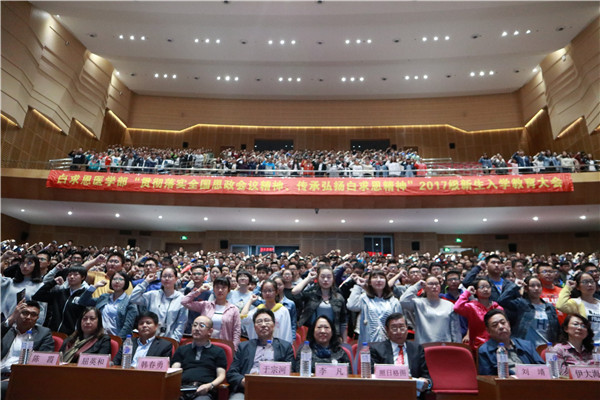 首先,大会由李凡教授向新生简要地介绍了白求恩医学部的基本情况,并讲述了白求恩的辉煌事迹,赞扬了伟大的白求恩精神。紧接着,全体新生起立背诵《纪念白求恩》,歌颂无私奉献的白求恩同志。