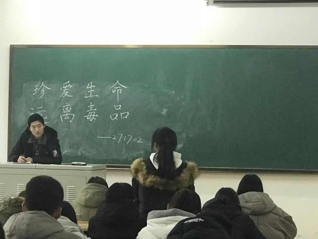 学生会社会实践部组织,班级团支书主持开展。会上,首先由两名同学对毒品的分类和危害以及如何有效戒毒等方面依次进行了详尽的介绍,讲解内容主要涉及鸦片、摇头丸等常见毒品的主要成分以及外观形状,染上毒瘾以后人的行为表现以及对人身心健康的危害等内容。两名同学还结合现今社会状况,针对如何有效戒毒、如何远离毒品发表了自己的看法。随后进行的是紧张刺激的毒品知识问答环节,同学们都踊跃举手抢答,答案正确率普遍较高。
