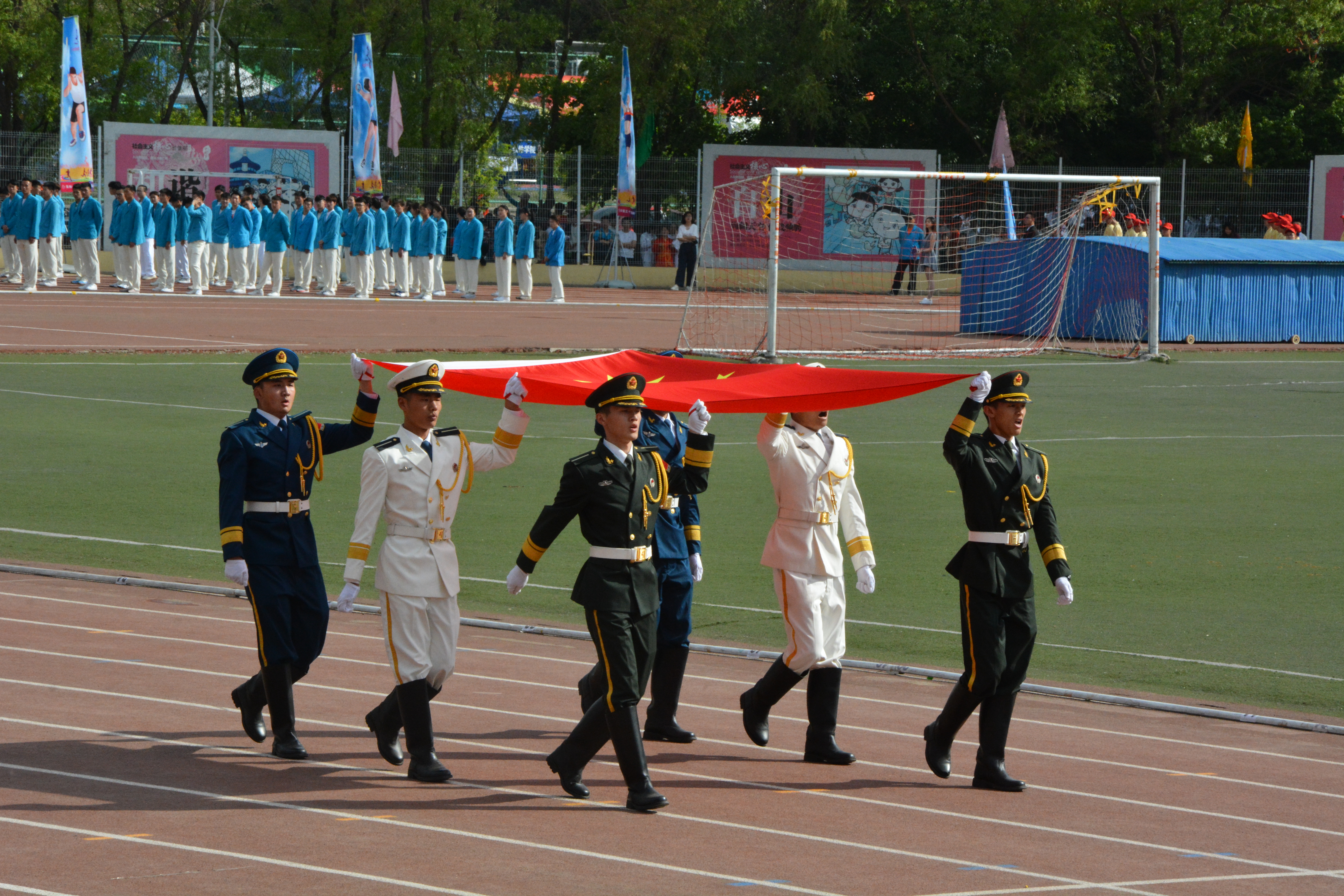 各代表队入场后,全体起立奏唱国歌与校歌。接下来由校领导致开幕词,李元元校长首先代表学校对运动会的隆重举行表示祝贺,向精心筹备运动会的老师们、同学们表达了诚挚的谢意,向全体运动员、裁判员表示亲切的问候和良好的祝愿。随后,认真总结了过去一年中学校在体育工作中所取得的丰硕成果,其中不仅包括各个田径项目成绩的不断刷新,还包括学校体育设施的不断完善。他谈到发展体育事业是社会主义精神文明建设的一部分,是增强广大师生身体素质的重要环节,对实现在校大学生的德智体美等方面的发展具有重要意义。