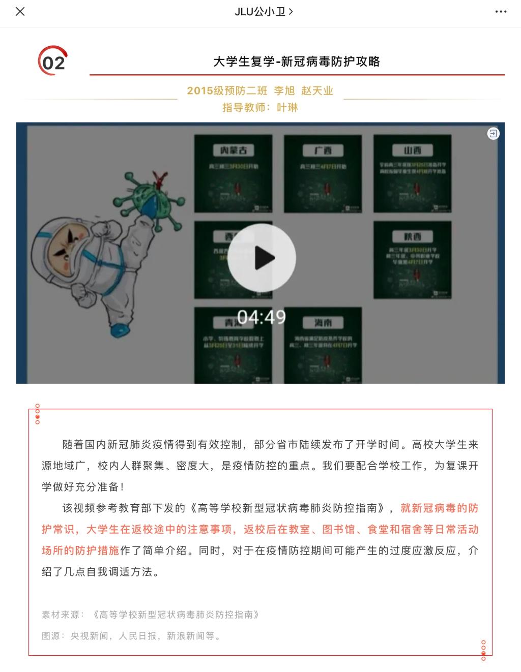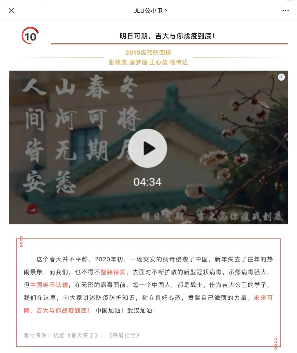 通过此次大学生健康防疫科普作品比赛,参赛选手宣传了科学防疫知识,解读了疫情动态,帮助更多的吉大师生掌握科学防护方法,树立积极心态,营造了健康和谐的校园环境和积极向上的学习氛围,为坚决打赢疫情防控阻击战贡献了自己的力量。