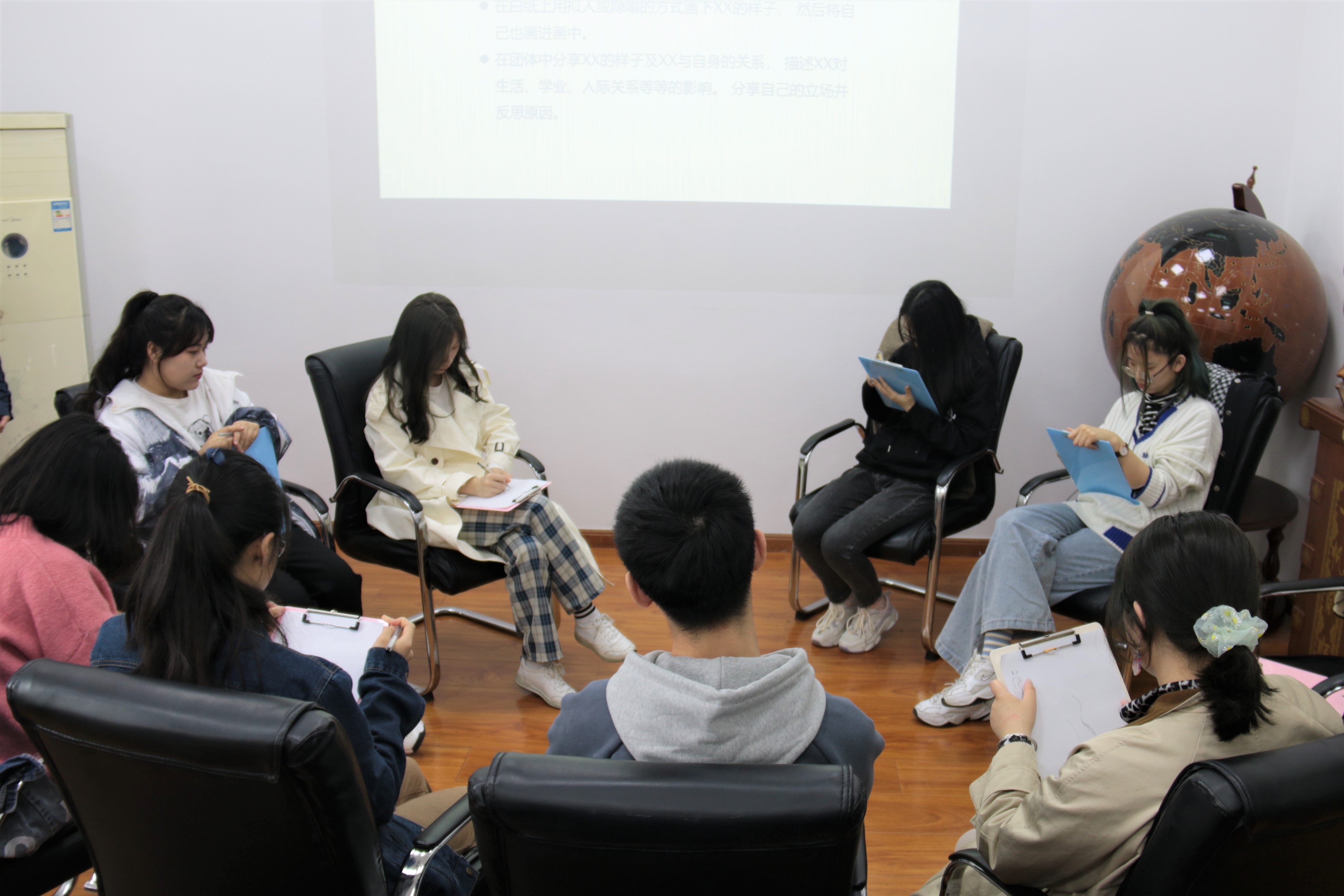 活动开始前,各位同学们先进行了简单的自我介绍,接着在主持人的带领下,玩起了暖场小游戏,轻松愉快的游戏拉近了同学们之间的距离。在同学们的欢声笑语中,活动正式开始。主持人首先引导大家为自己近期的烦恼赋予一个具体的形象,在纸上画出并且显示出“它”与自身的关系。同学们仔细思索,认真地在纸上画出困扰自己的心结,随后大家依次展示了自己的画作,并讲解了画面的寓意。随后,主持人为大家准备了一系列问题,意图帮助同学们理清烦恼与自身的关系,审视它对自身的影响,以便找出解决方法或者调整心态重新接纳。同学们在纸上作答,并向其他同学讲解自己的想法,将自己的思考与忧虑充分展现出来。在最后一个环节中,同学们畅所欲言:或是讨论彼此烦恼之间的共同点;或是介绍行之有效的经验方法;或是分享自己的心路历程。各位同学的参与热情高涨,都得到了分享心声的机会,也从其他同学的话语中得到了一些收获。至此,本次团体心理辅导活动圆满结束。