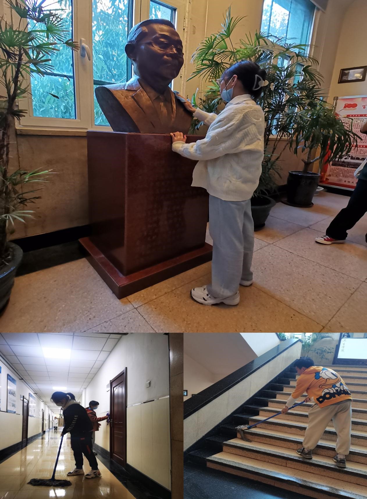 相约七日上午,几把拖布,几块抹布,各区域的负责人和志愿者开始了元气满满的劳动工作。从走廊到楼梯,从大厅到楼外……“唯亲身体会,方知事易难”,同学们在一次次弯腰抬头中感受到了劳动的苦乐交织,体会了劳动的不易。